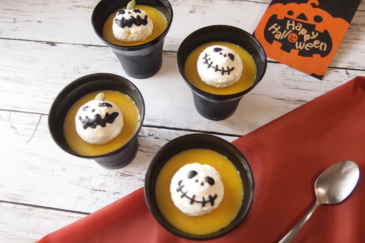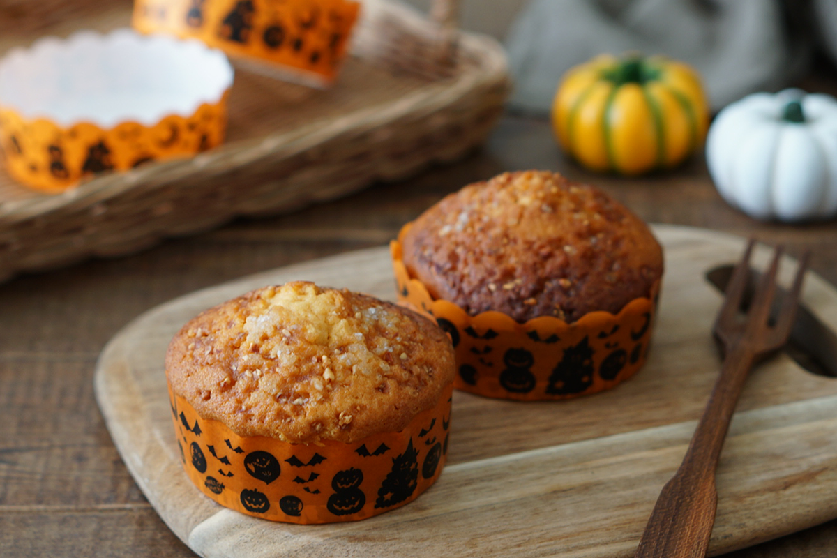 かぼちゃを使ったプリンやマフィン、クッキーなど定番メニューも、ハロウィンデザインの包材を使うだけで季節感が演出できます